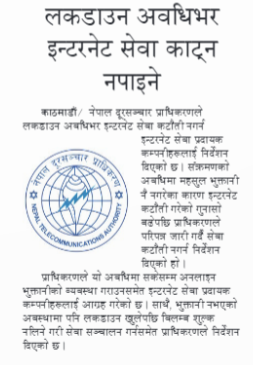नेपाल दूरसञ्चार प्राधिकरणले लकडाउन अवधिभर इन्टरनेट सेवा कटौती नगर्न इन्टरनेट सेवा प्रदायक कम्पनीहरूलाई निर्देशन दिएको समाचार आजको नयाँपत्रिकामा छ ।...