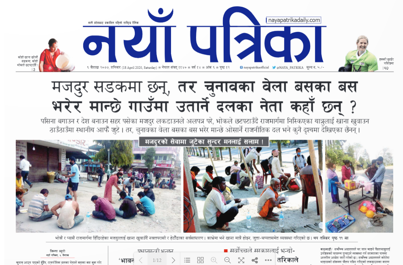 सडकमा विचल्ली परेका मजदुरका विषयमा आजको नयाँपत्रिकाले यस प्रकारको मुख्य समाचार छापेको छ । नयाँपत्रिकामा लेखिएको छः पसिना बगाउन र...