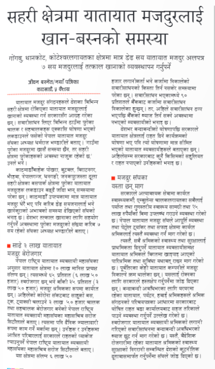 सहरी क्षेत्रमा यातायात मजदुरलाई खान–बस्नको समस्या आजको नयाँपत्रिकाले लेखेको छ । नयाँपत्रिकामा लेखिएको छः यातायात मजदुर संगठनहरूले देशका विभिन्न सहरी...