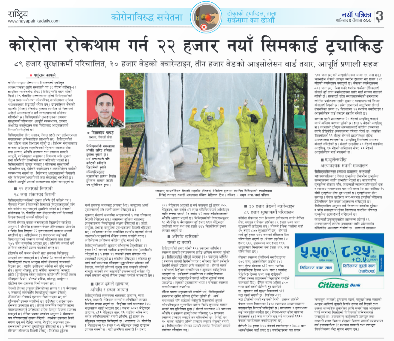 कोरोना रोकथाम गर्न २२ हजार नयाँ सिमकार्ड ट्राकिङ गरिएको समाचार आजको नयाँपत्रिकाले लेखेको छ । नयाँपत्रिकामा लेखिएको छः कोरोना भाइरस...