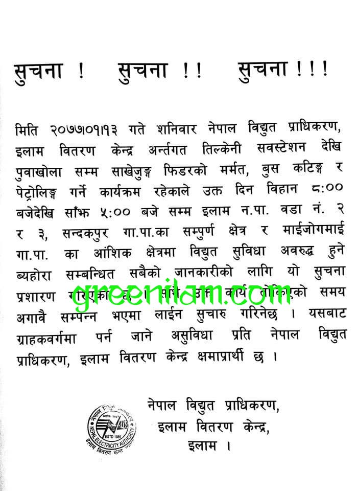 थप समाचार Detailsइलाम, १२ वैशाखः इलाम जिल्लाको पुर्वोत्तर क्षेत्रहरुमा भोलि शनिबार दिउसोभर विद्युत सेवा विहिन हुने भएको छ । नेपाल विद्युत प्राधिकरण...