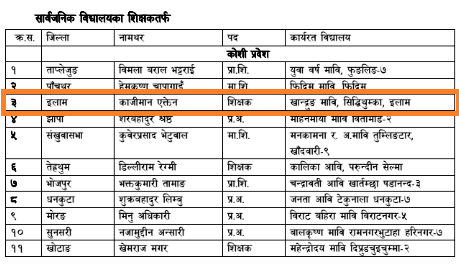 थप समाचार Detailsइलाम, २ असोजः राष्ट्रिय शिक्षा दिवस, २०८० का अवसरमा मंगलबार पुरस्कृत हुने उत्कृष्ट विद्यालय, शिक्षक, कर्मचारी, प्राध्यापक, प्रिन्सिपललगायत व्यक्तिको नामावली...
