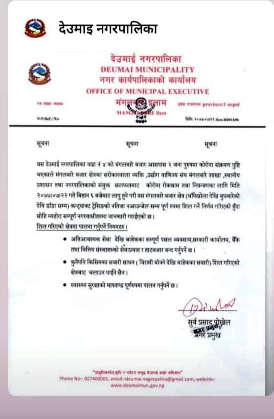 इलाम, २१ कार्तिकः देउमाई नगरपालिकाको मंगलबारे बजार आसपास दुईजना पुरुषमा कोरोना संक्रमण पुष्टि भएपछि कन्ट्रयाक ट्रेसिङको नतिजा नआएसम्मको लागि मंगलबारे...