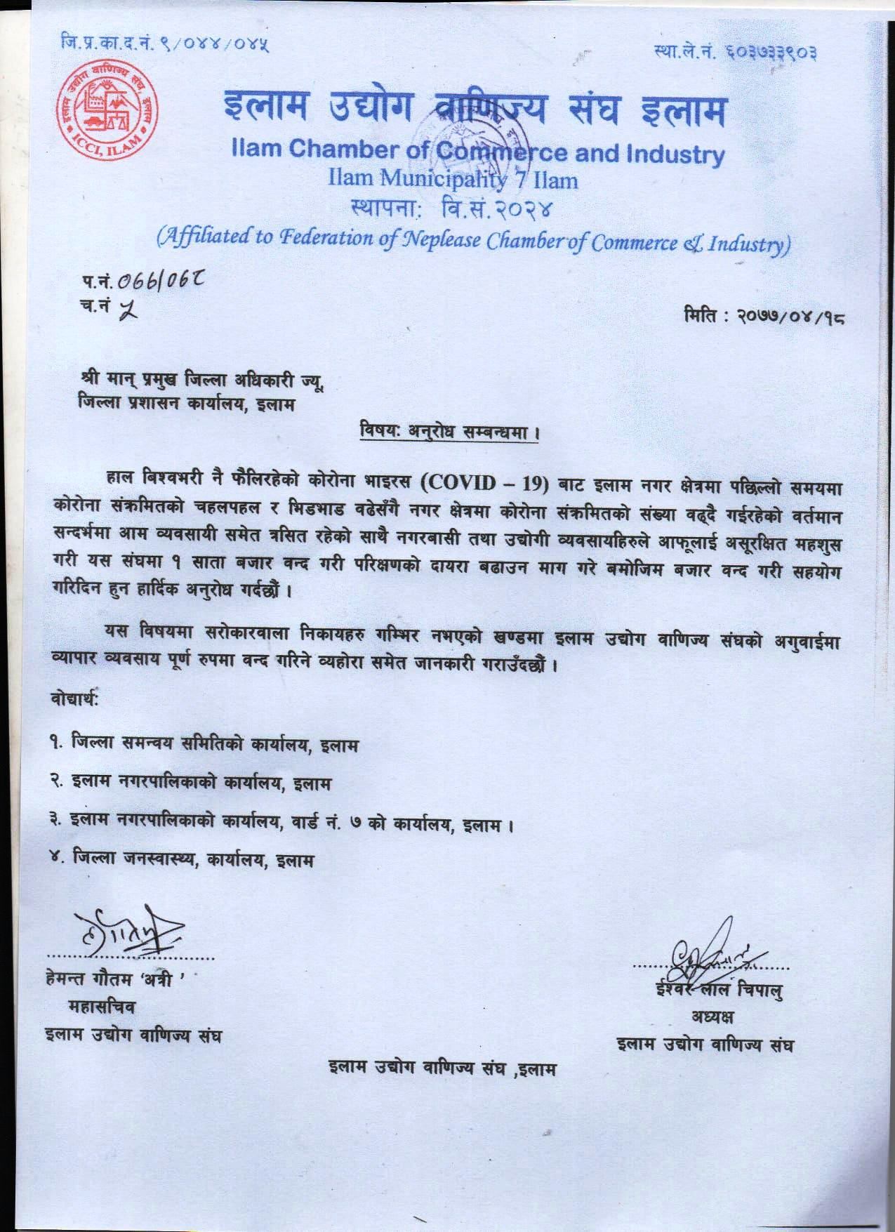 इलाम उद्योग वाणिज्य संघद्धारा एक साता व्यापार व्यवसाय बन्द गर्न अनुरोध